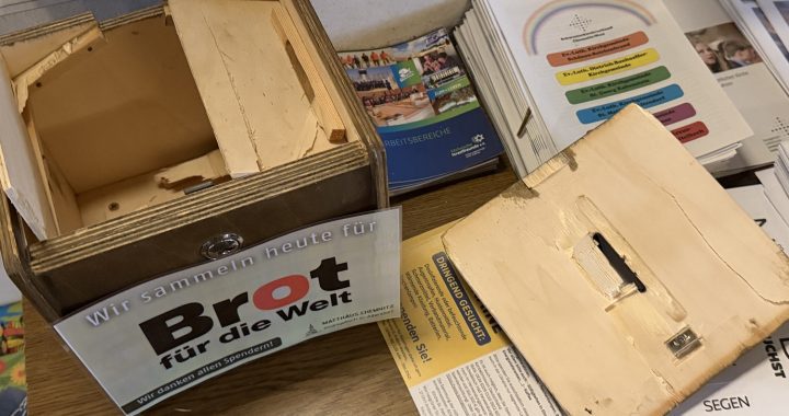 Die Täter zerstörten unter anderem die Spendenbox, in der die Gemeinde zur Zeit für die Aktion „Brot für die Welt“ sammelt, vollständig und nahmen den Inhalt einfach mit.